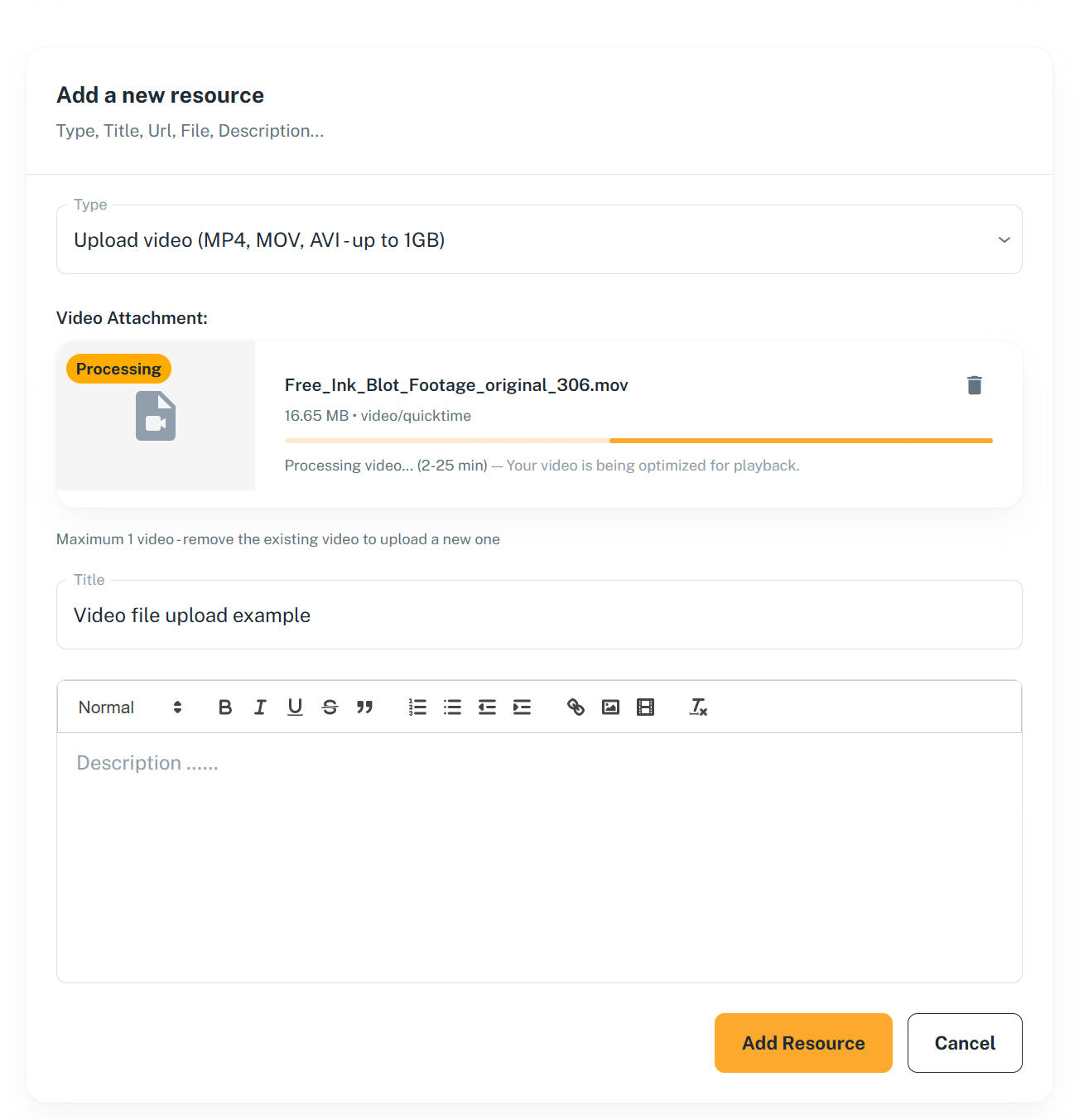 The uploading will start and will quickly be followed by a processing stage, the duration of which will depend on the size of your file. Please wait till the processing is finished to add your resource or leave the page, otherwise the upload will not be completed.