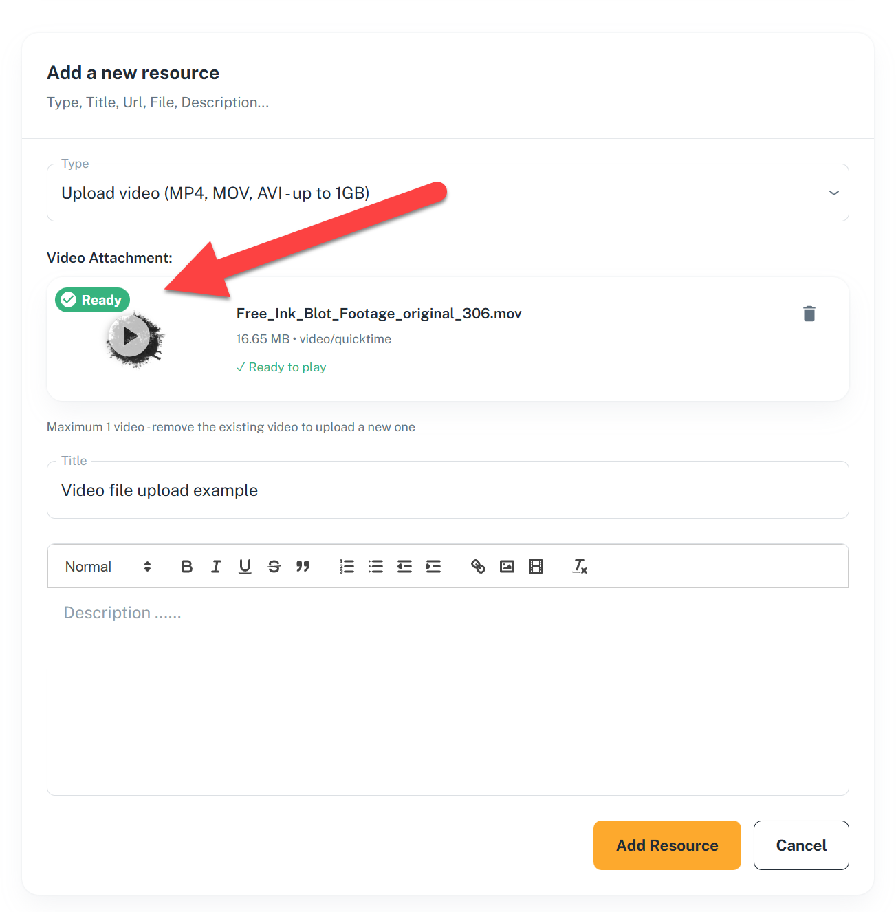 When adding a Video file as a resource, there are a few specific steps to follow, first you will use that uploader: